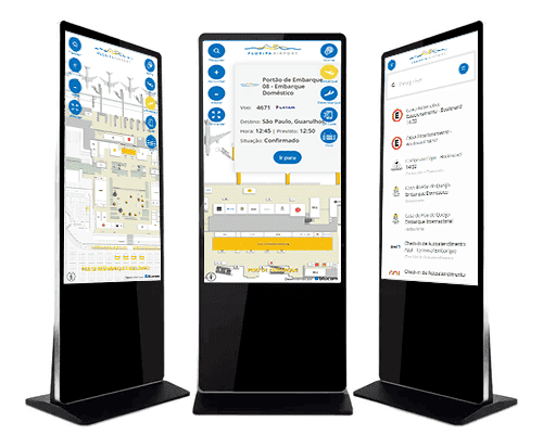 Em aeroportos, exibe informações de voos em tempo real, melhorando a experiência do passageiro com navegação contextual e eficiente.